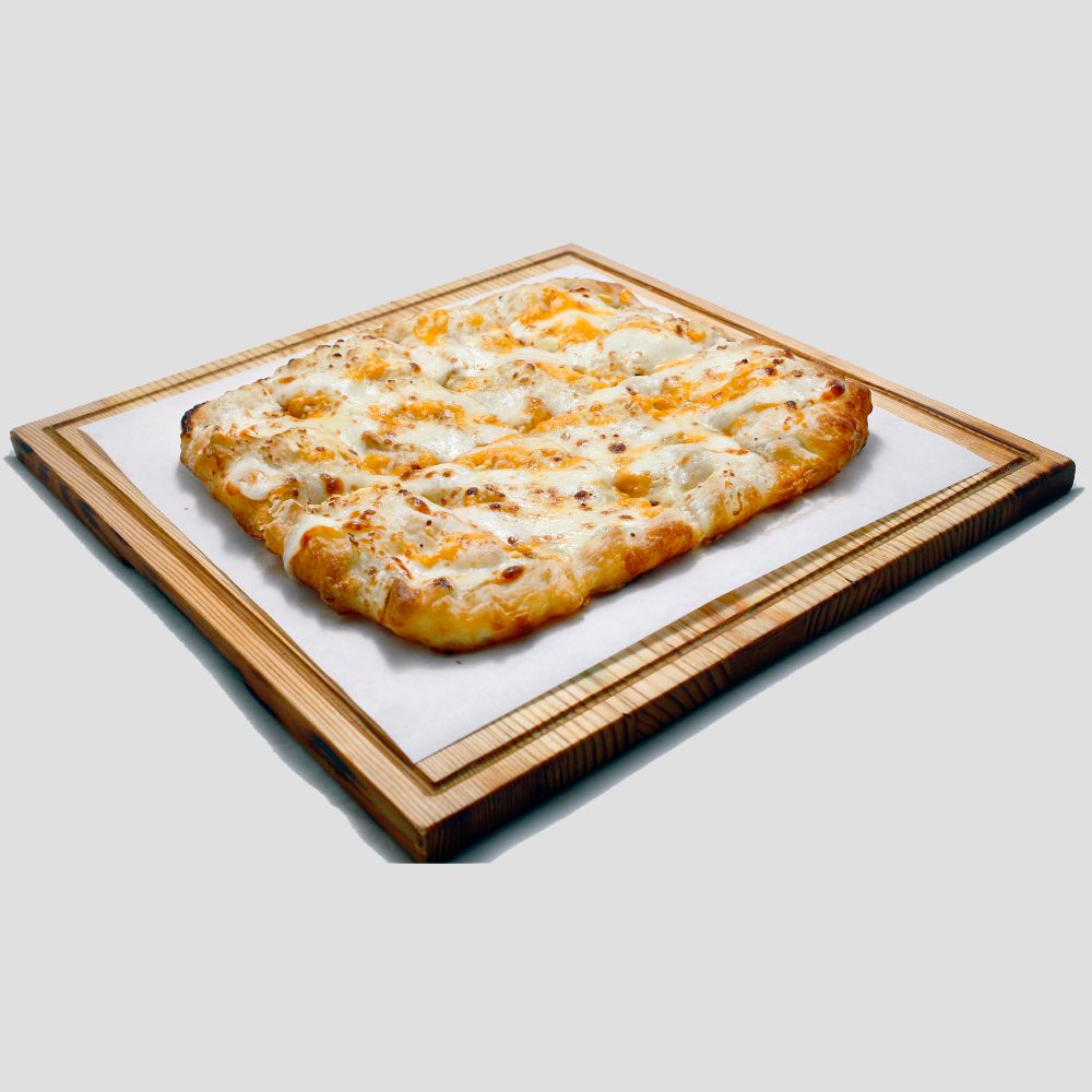 Воздушное римское тесто, сыр моцарелла, пармезан, чеддер и сулугуни, сливочный соус.