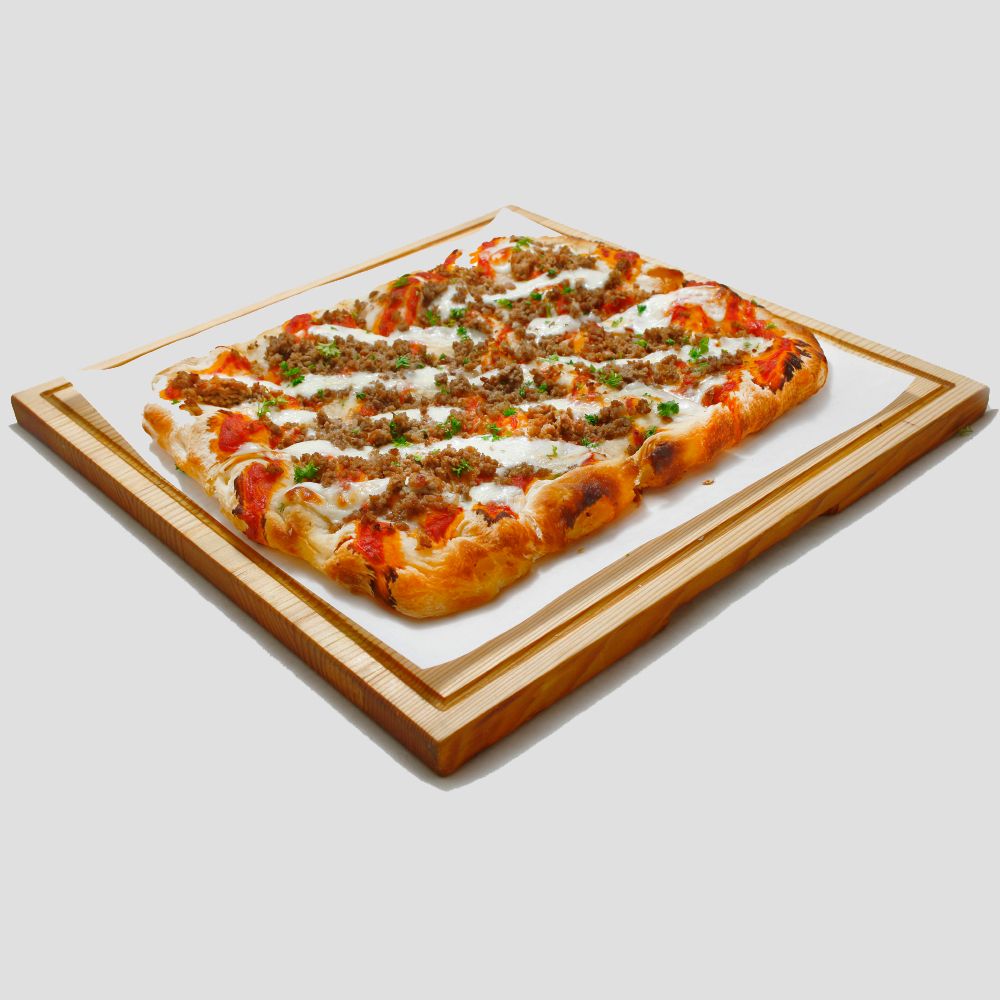 Воздушное римское тесто, фарш говяжий, томатный соус, сыр моцарелла.