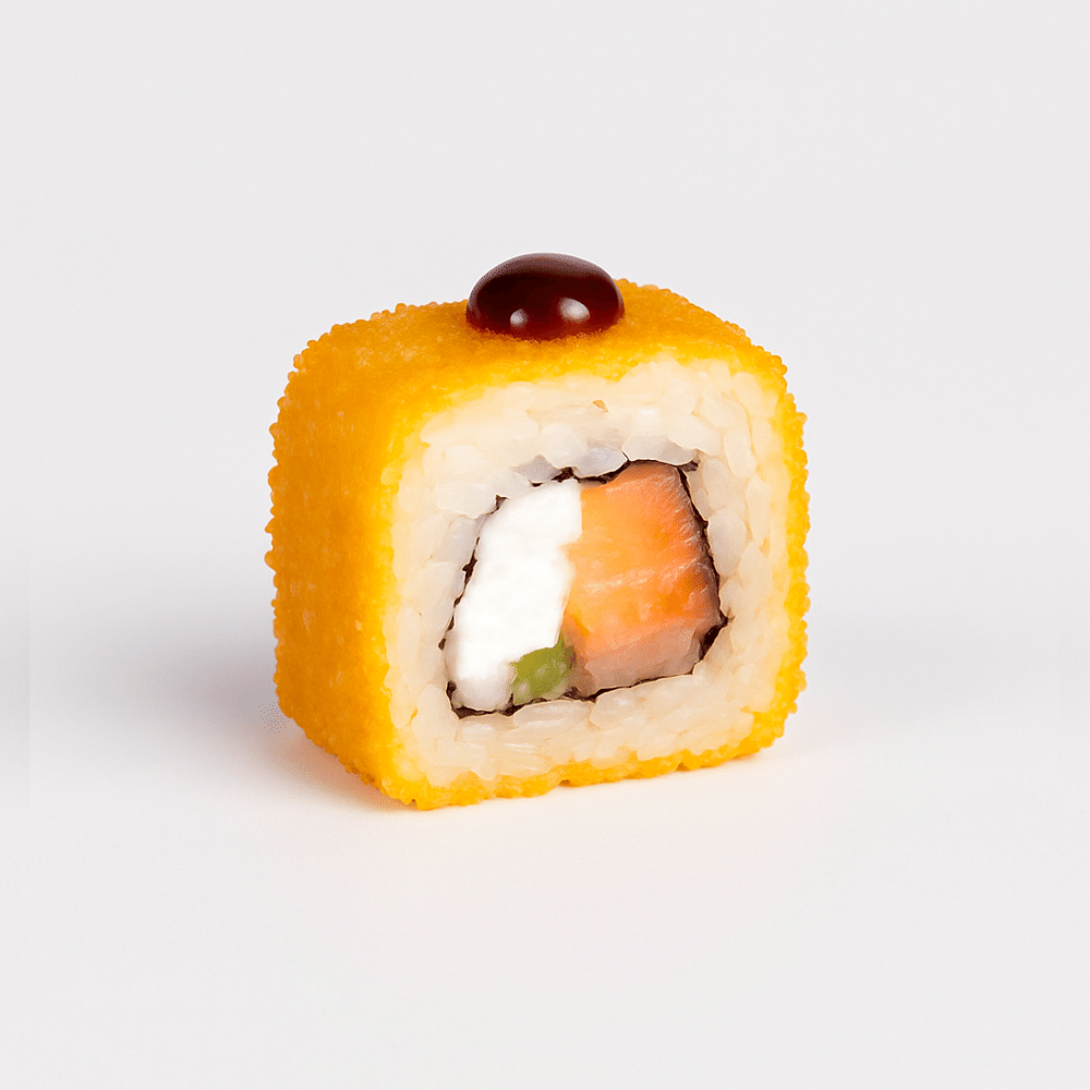 Лосось, огурец, сливочный сыр, сухари панко, темпура, соус унаги, нори.