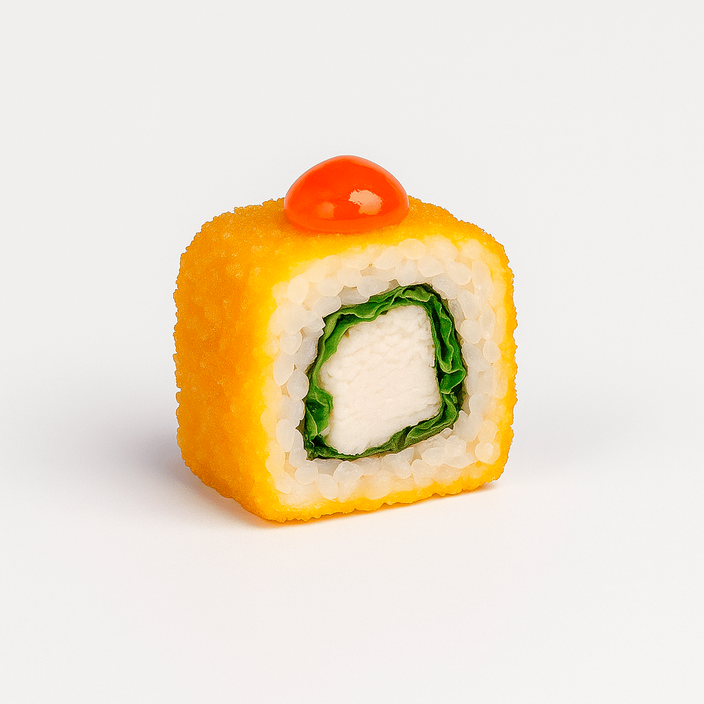 Филе цыплёнка, лист салата, зеленый лук, соус спайси, темпура, сухари панко, нори.