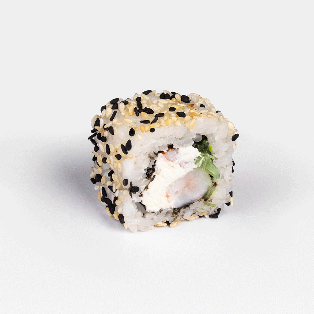 Креветки, сливочный сыр, чукка, кунжутные семечки, нори.