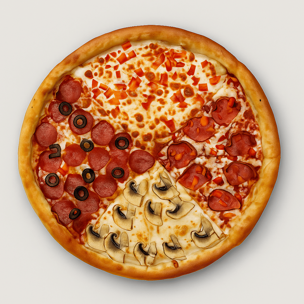 Пепперони, ветчина, моцарелла, болгарский перец, шампиньоны, помидор, маслины, соус топатный и сливочный.