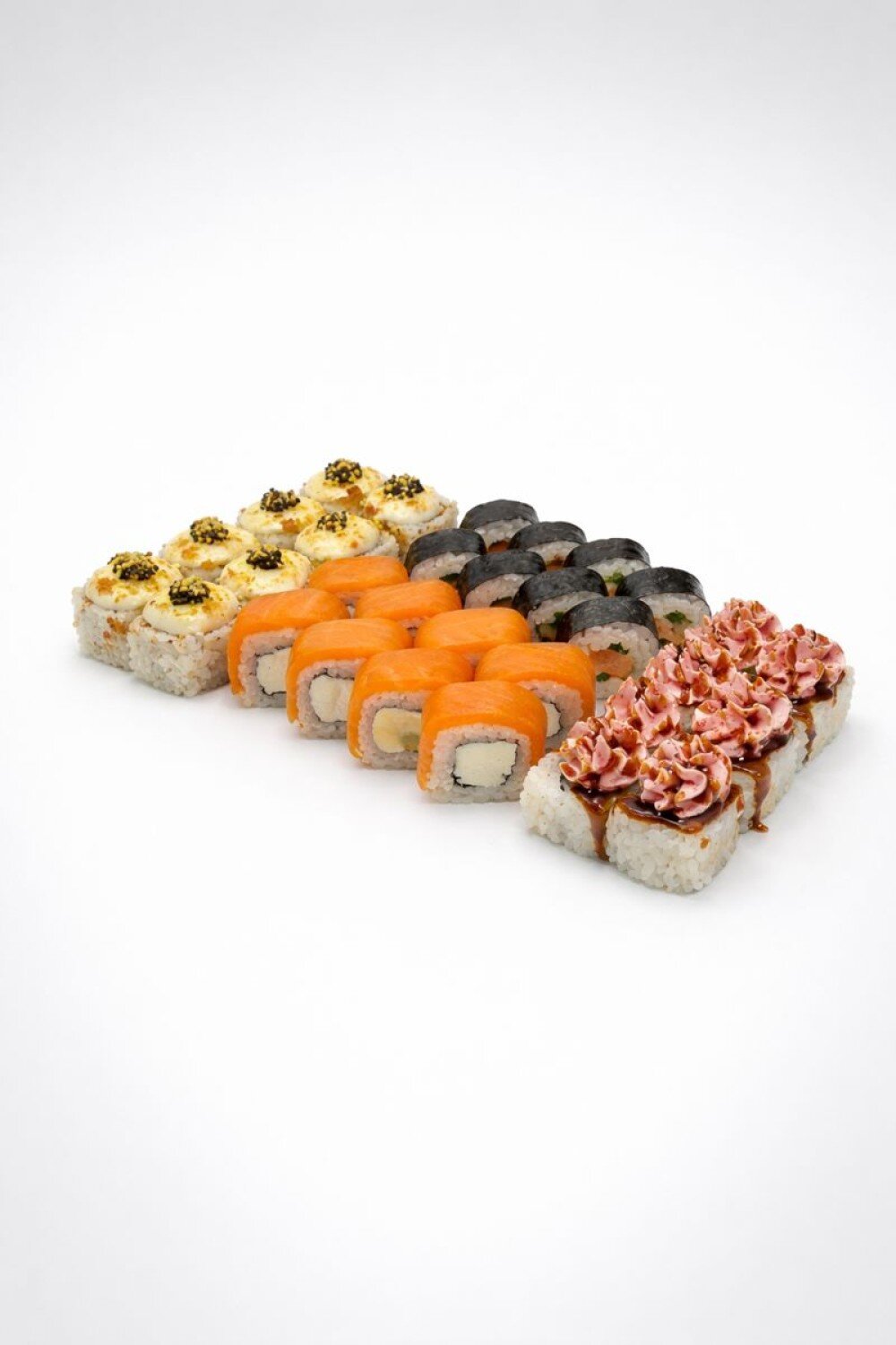 Филадельфия маки 8 шт, Лосось лайт 8 шт, Ролл с лососем и шапкой лава 8 шт, Запечённый ролл с лососем и стружкой тунца 8 шт.