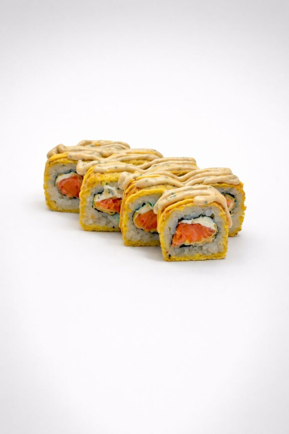Лосось, сливочный сыр, блинчик тамаго, соус чеддер и соус вителло тоннато.