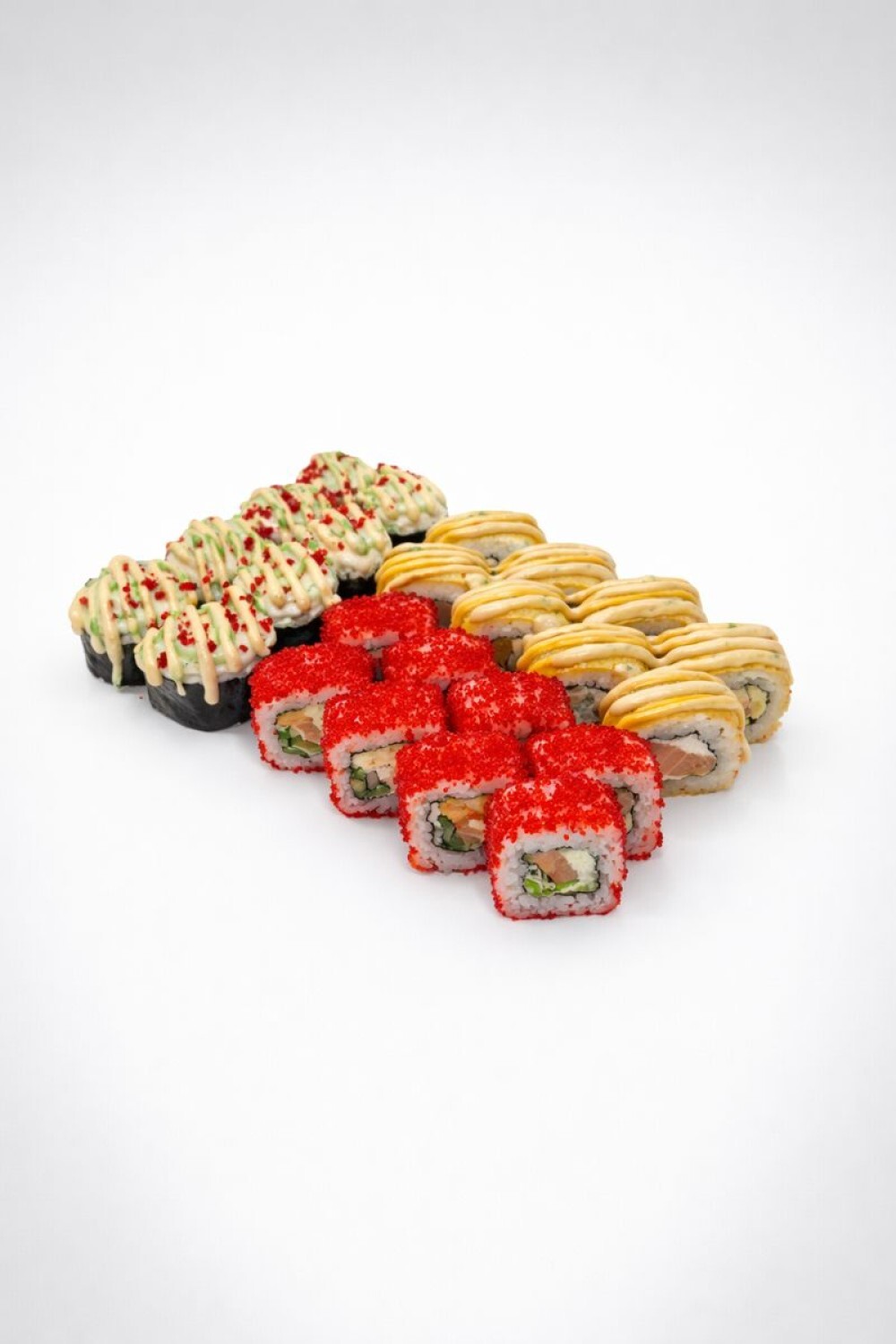Ролл с лососем и икрой 8 шт, Жареный ролл с лососем и тамаго, Запечённый ролл с копченым лососем и моцареллой 8 шт.