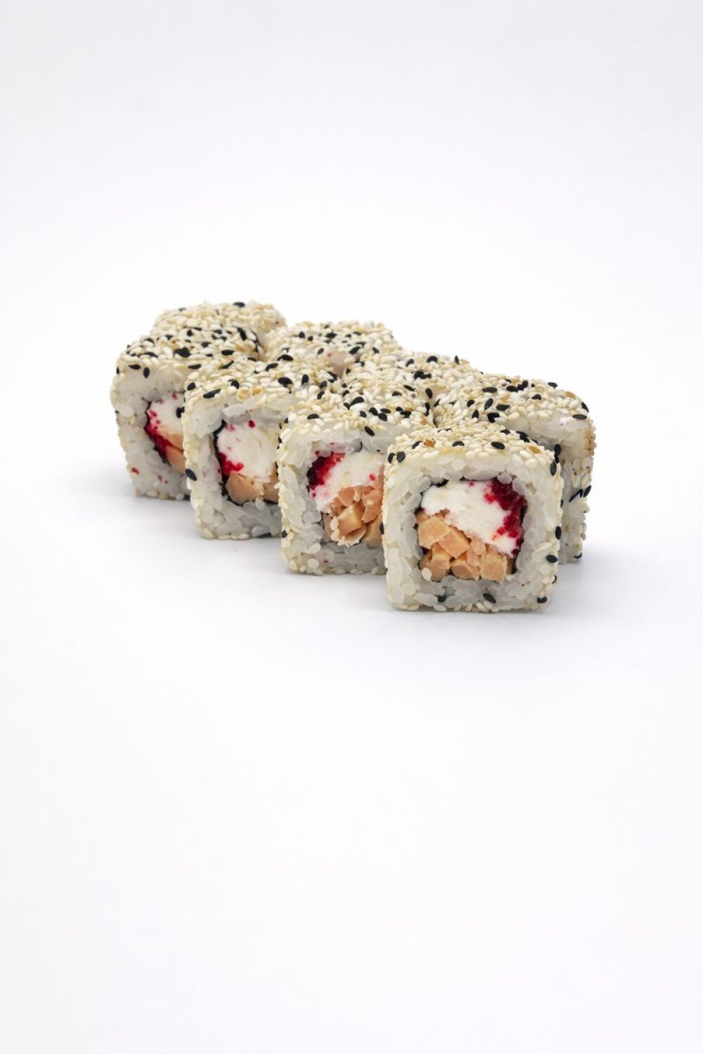 Лосось, тобико, сливочный сыр, кунжутные семечки.