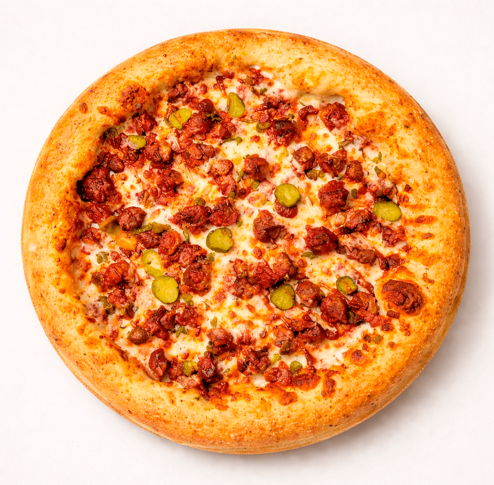 Сочные боллы из баранины, моцарелла, острый перец, корнишоны, томатный соус и соус барбекю, фирменный сырный бортик.