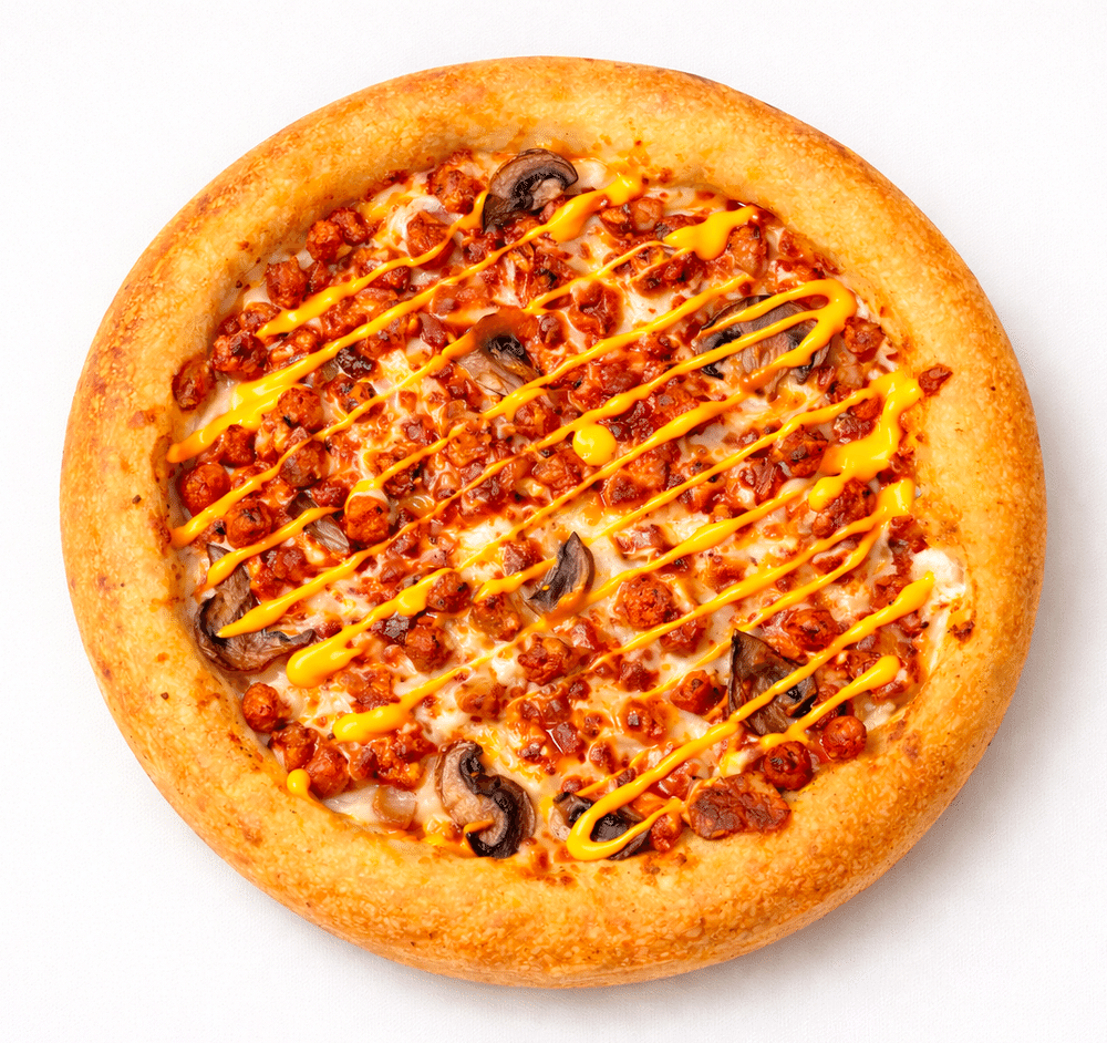 Куриные боллы из цыплёнка, шампиньоны, моцарелла, томатный и грибной соусы, сырный соус и фирменный сырный бортик.