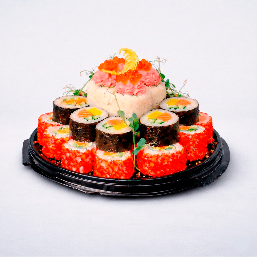 Праздничный суши-торт из четырёх видов роллов: калифорния с лососем, свежий каппа маки с огурцом, ролл с лососем под нежной шапкой лава и планета маки.