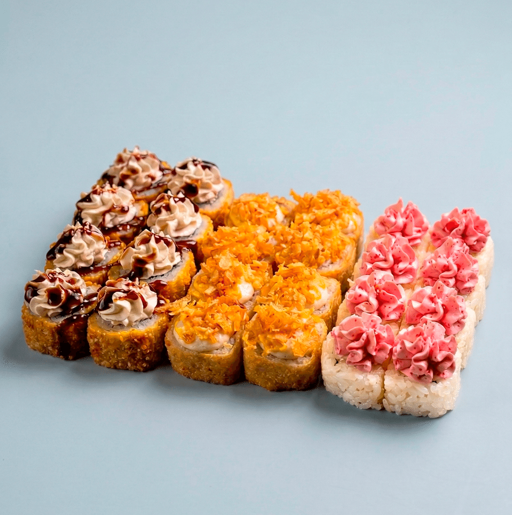 Цезарь с начос 8 шт, Жареный ролл с лососем и снежным крабом 8 шт, Ролл с лососем и шапкой лава 8 шт.