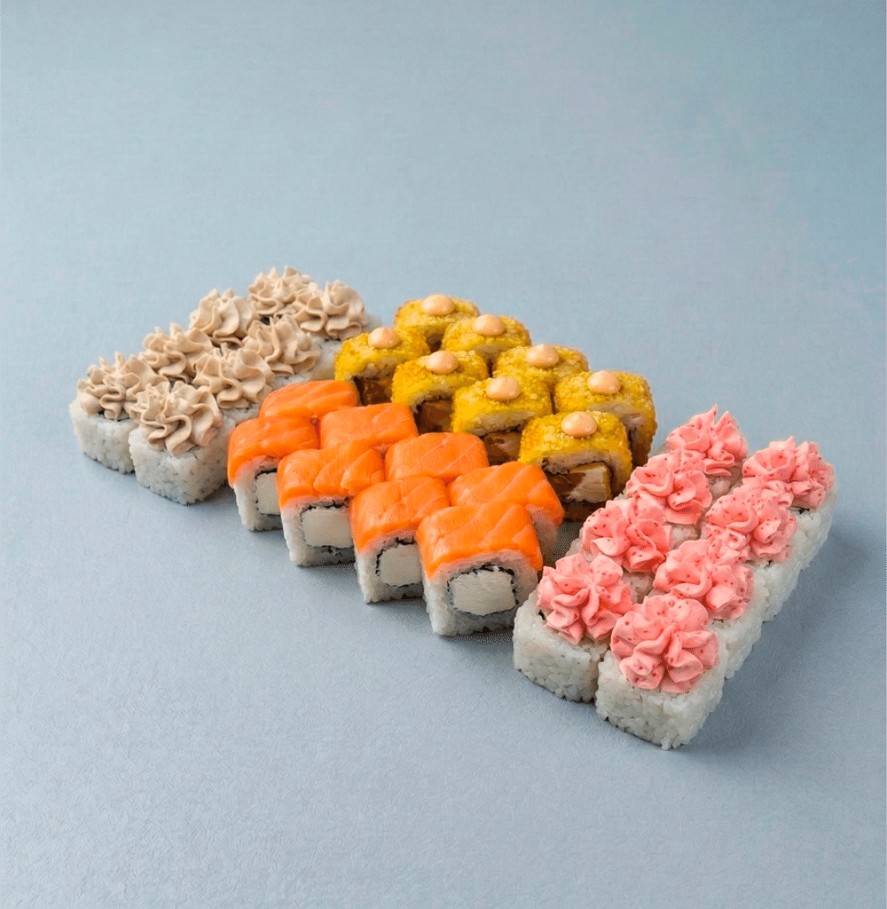 Фила-лайт 8 шт, Дубль чиз 8 шт, Мадрид 8 шт, Ролл с лососем и шапкой лава 8 шт.