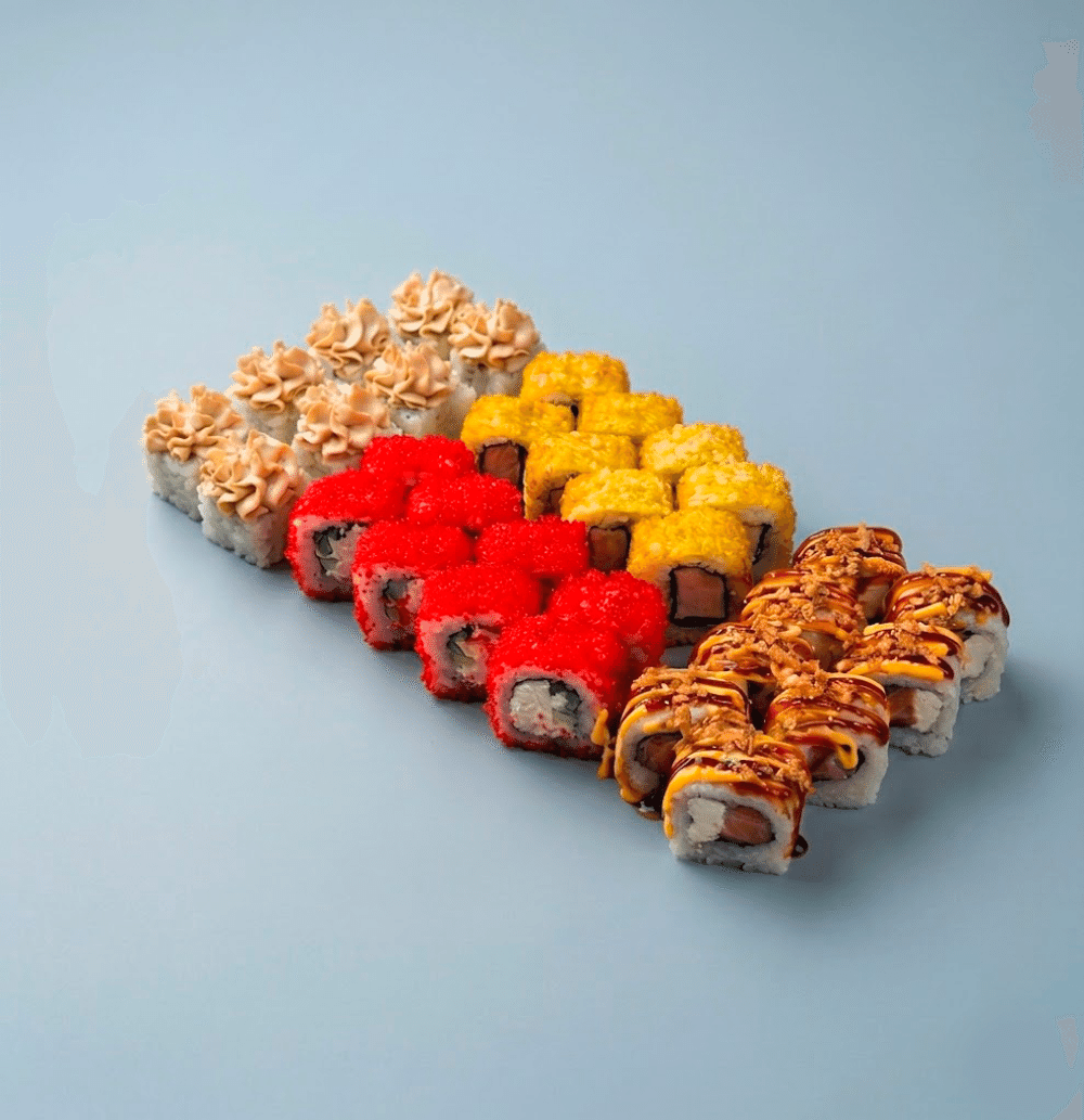 Мадрид 8 шт, Сливочный ролл с лососем и соусами 8 шт, Калифорния с крабом 8 шт, Тори темпура 8 шт.