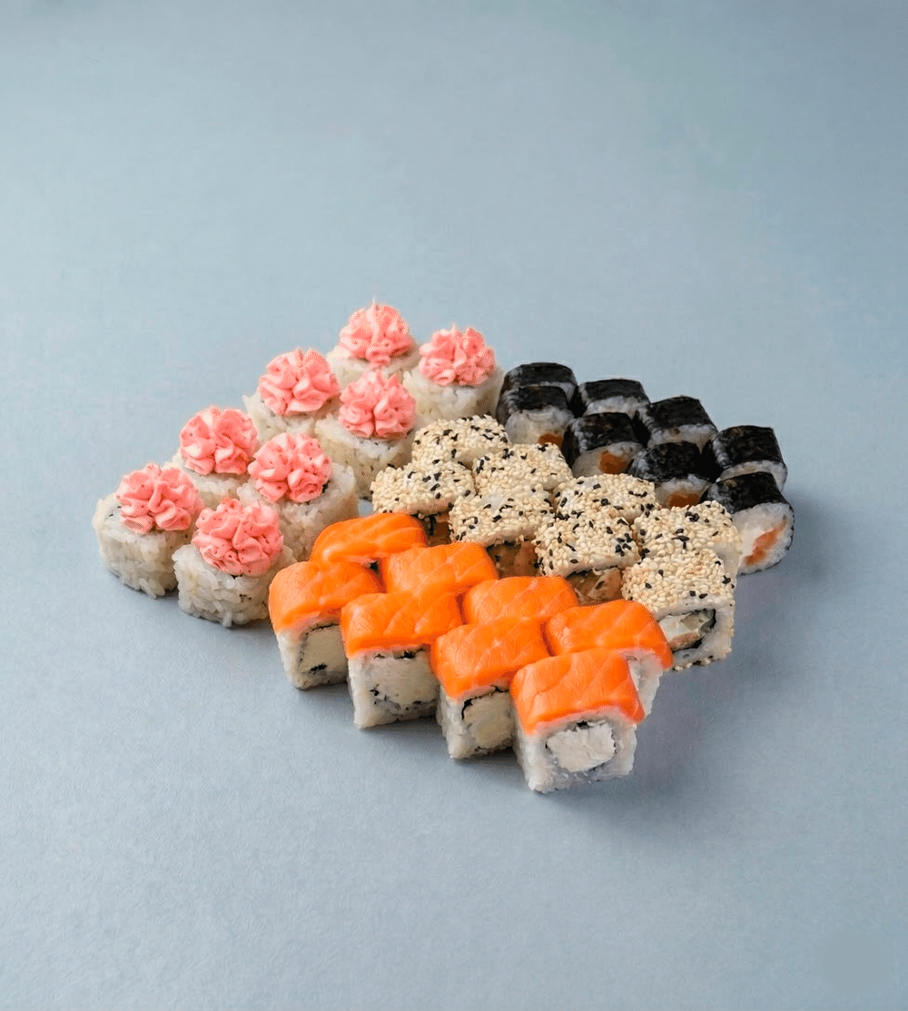 Фила-лайт 8 шт, Киото маки 8 шт, Сливочный ролл с лососем 8 шт, Ролл с лососем и шапкой лава 8 шт.