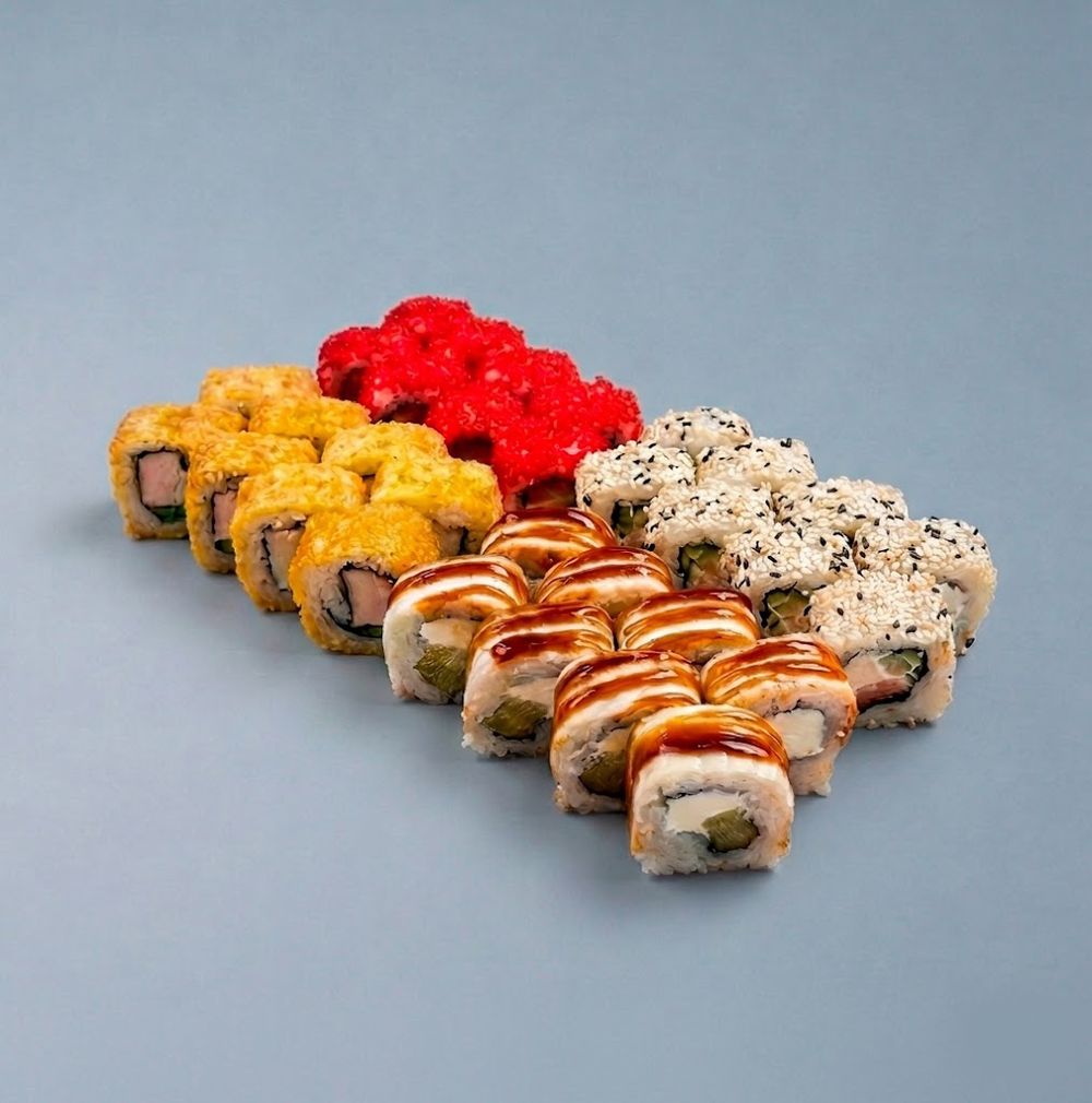Киото маки 8 шт, Калифорния с лососем 8 шт, Тори темпура 8 шт, Унаги онигара 8 шт.