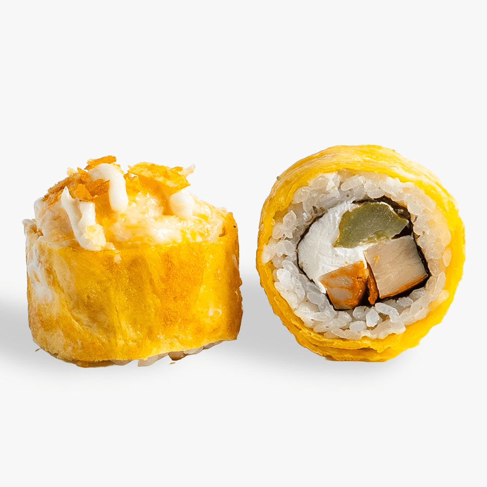 Филе цыплёнка, сливочный сыр, маринованный огурчик, тамаго, чеснок, сырная шапка, нори.